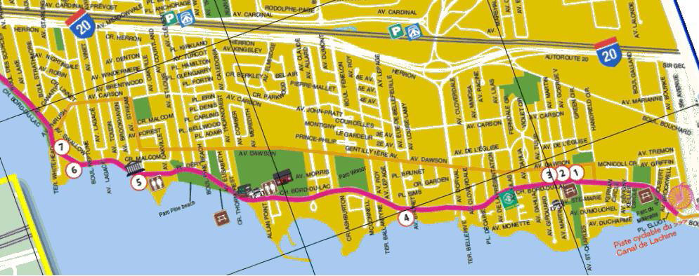 Le long de la voie, surveillez la présence des trois anciens marqueurs de péage. Le Musée de Dorval est un endroit agréable pour s’arrêter avant de poursuivre à Pointe Claire. Along the way you should keep an eye on the old toll markers. There are three of them. A great place to stop is the Museum of Dorval before continuing on to Pointe Claire. |
