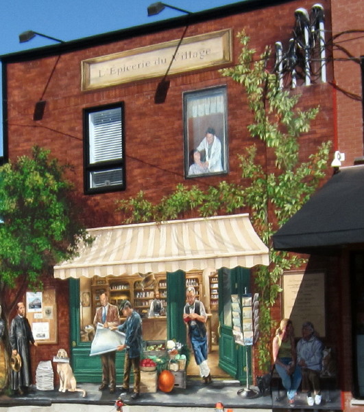 Arrêtez-vous à l’Épicerie du Village et admirez la nouvelle murale géante qui dépeint les 300 ans du villagede Pointe-Claire. Stop