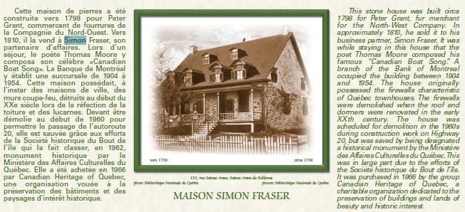 La maison de Simon Fraser (explorateur canadien) est située au cœur du village, en face des écluses et du canal. À cet endroit, on peut continuer vers la partie nord du Circuit ou rejoindre la piste cyclable du Canal Soulanges. |